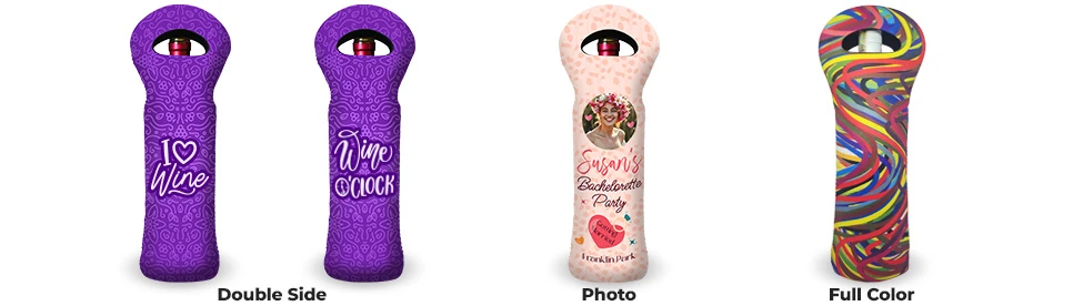 Heat sublimation pressing is definitely the way to go when customizing your wine coolie tote bag. This option allows us to print on both sides of the bag including the handle. We can print any picture you may have, a quote or saying you like or we can just find a colorful pattern that looks good to you. Also with heat sublimation it is possible to print one continuous image that wraps around, 2 identical images on both sides or 2 completely different images for each side of the coolie.