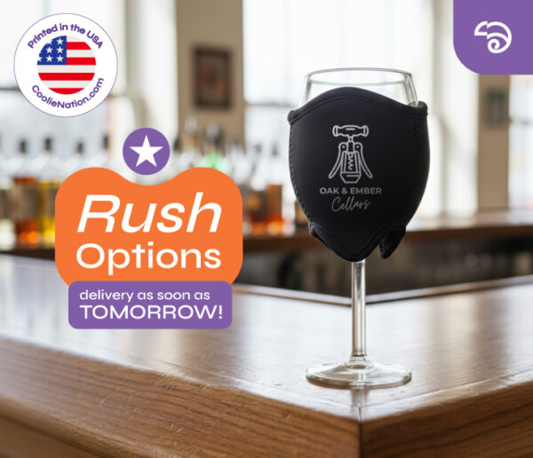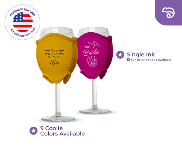 You can print your personalized design in a single color or multiple color design when screen printing, which we recommend.The ink choices are much more diverse, including specialty ones like shimmering ink. Our wine glass coolie can be printed on 3 different sides with either the same or different designs. Not only that, you can feel good about the fact that all our products are printed by us in the good ‘ol USA!
