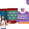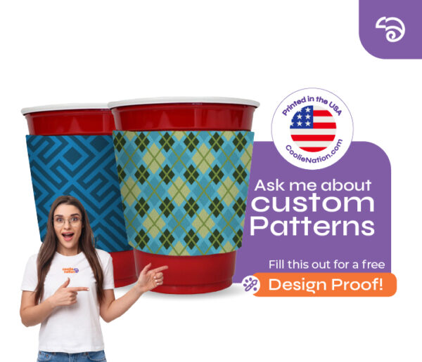 The sleeve coolie is printed with a heat press onto unsewn coolie, this means that the designs are created digitally and can be anything. You also are able to choose the background for your design, it can be any single color, mixture of colors or something more fun like tiedye. With these printing methods the Solo Cup sleeve can have the same image on both sides, two different images or one continuous image that stretches across the whole sleeve.